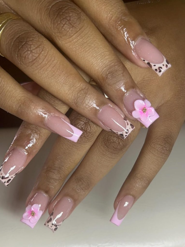 Romantic Pink French edges get a wink of attitude from micro-leopard panels and a single sculpted flower. On a long square silhouette, the contrast reads fashion-forward rather than cutesy—think “gallery opening after work.”