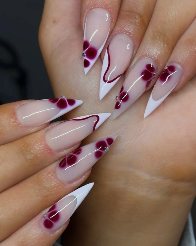 Whisper-thin White tips meet merlot petals drifting across stiletto lengths, dotted with tiny gems. The berry tone nods to red without overpowering—great for dinner dates or holiday parties when you want an artsy design.