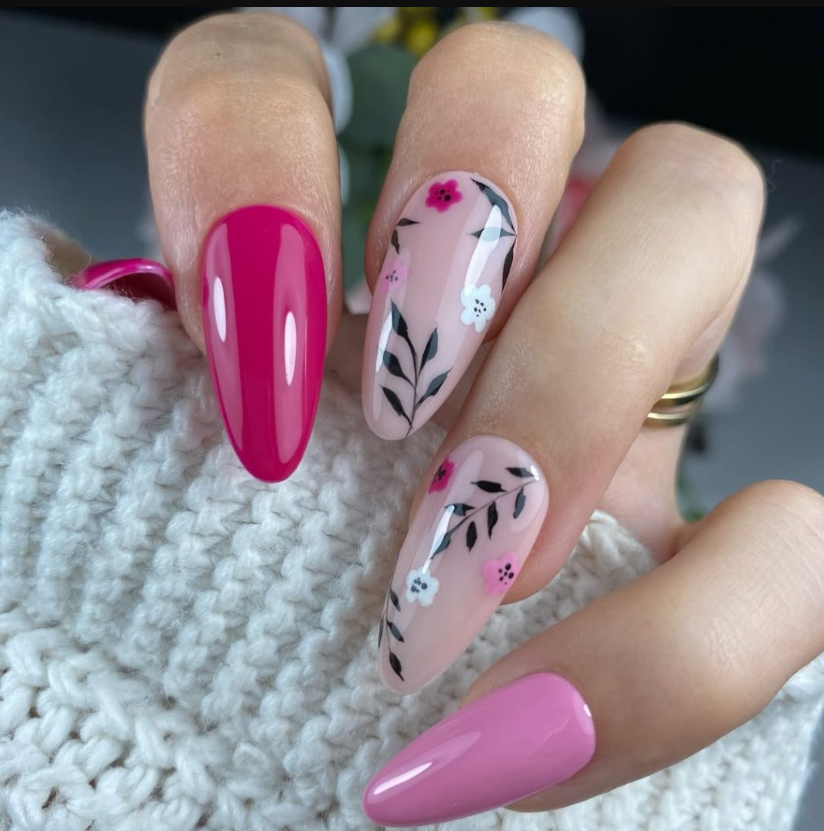 A smart rotation: two glossy pink solids plus two nude nails hand-painted with slender black stems and tiny blossoms. The oval/soft almond shape keeps it practical for a laptop life, while the contrast linework adds editorial polish. Tell your artist you want “two solids, two botanical accents with black and leaf outlines”—it’s a refined design that still feels cute. Pair with a trench and jeans now; switch to a shirt dress for summer.