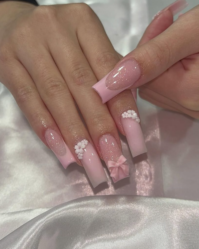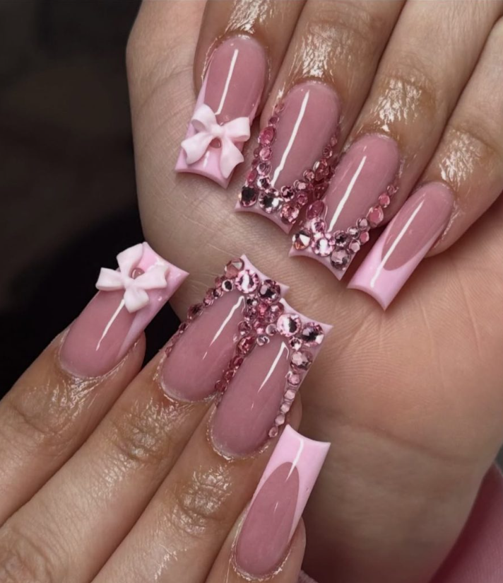 Long square tips meet blush bases, baby-pink edges, 3D bows, and crystal outlines that shimmer like couture beading. It’s a theatrical twist on a French tip: half princess, half pop star.