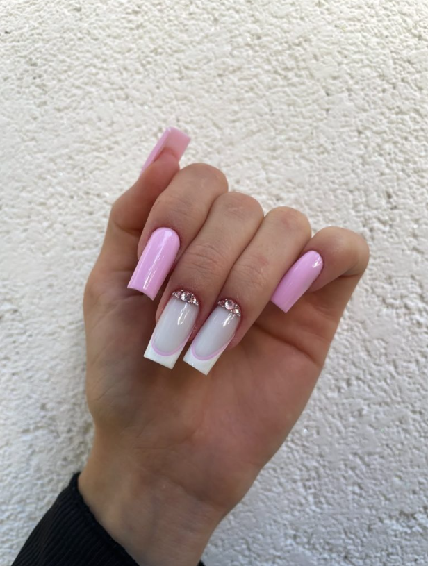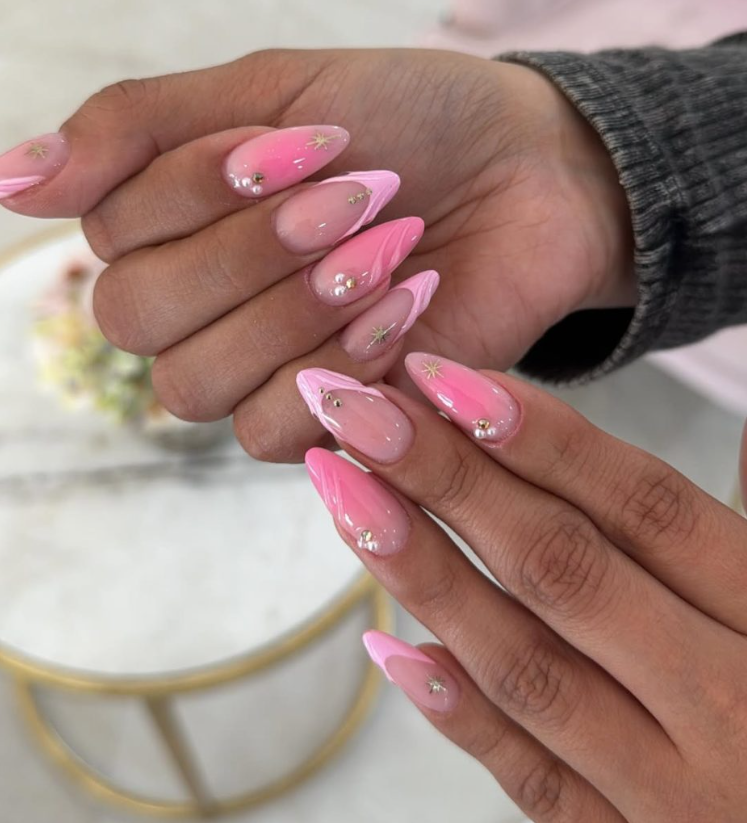 A sculpted almond silhouette blends opaque bubblegum and sheer blush, then adds airy white ribbons and tiny starbursts. A few crystals near the cuticle bring subtle glitter, catching bar light or brunch sunshine. It’s a trendy mixed-media design that still reads as grown-up because the palette stays within pink.