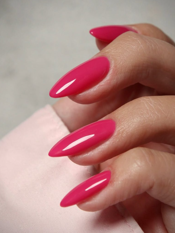 High-shine fuchsia on tapered almond tips—nothing but color and a glassy seal. The hue reads bright and a touch hot, yet the streamlined shape keeps it elevated and simple. Ask your tech for a medium almond with a cool-pink gel and two thin layers for depth without bulk. Pair with a white tee and blue denim for summer 2026, or a gray blazer when you’re sprinting between meetings. This is the set that says you meant to make an entrance—no art required, just excellent prep and polish.
