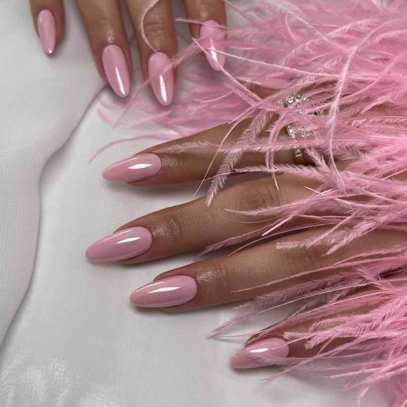 A seamless blush gel on tapered almond tips—no art, just mirror shine. This is the definition of almond simple: softly Light, elongating, and elegant in every setting from Zoom reviews to cocktail hours.
