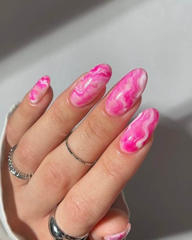Glossy ovals swim with pink-on-pink marbling: fuchsia, rose, and milky white veining that looks hand-poured. The sheen amplifies depth, so each nail feels like a tiny agate slice.