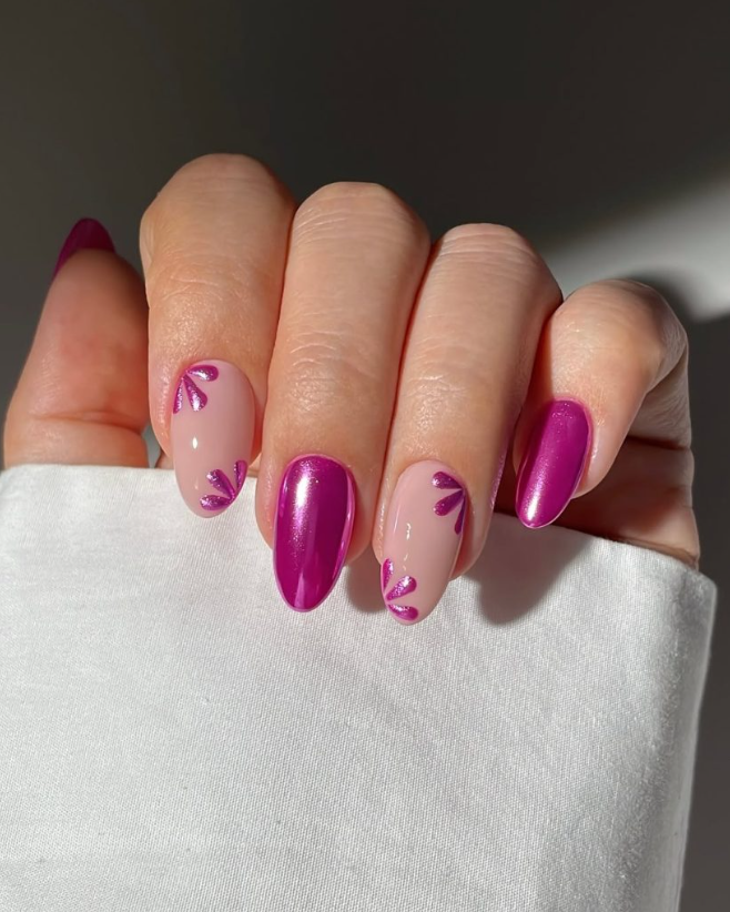 A modern mix: two nails in metallic magenta, the others nude with petal clusters at the cuticle in the same tone. The oval silhouette softens the saturated hue so it reads chic, not loud.