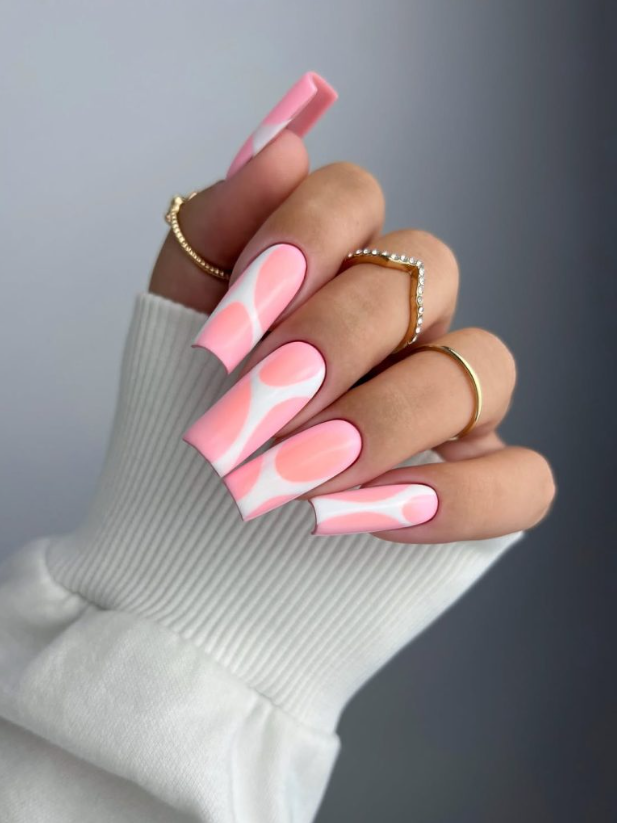 Cotton-candy pink meets clean white waves across long square nails, sealed in a velvet-matte top. The negative space and rounded shapes feel gallery-worthy yet simple enough for a busy week.