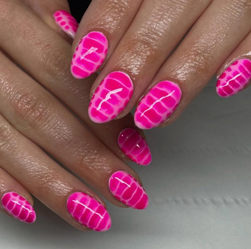 These oval sets stamp a crocodile-skin pattern in high-voltage pinks. The glossy topcoat makes the raised lines pop so the motif reads tactile without bulk.