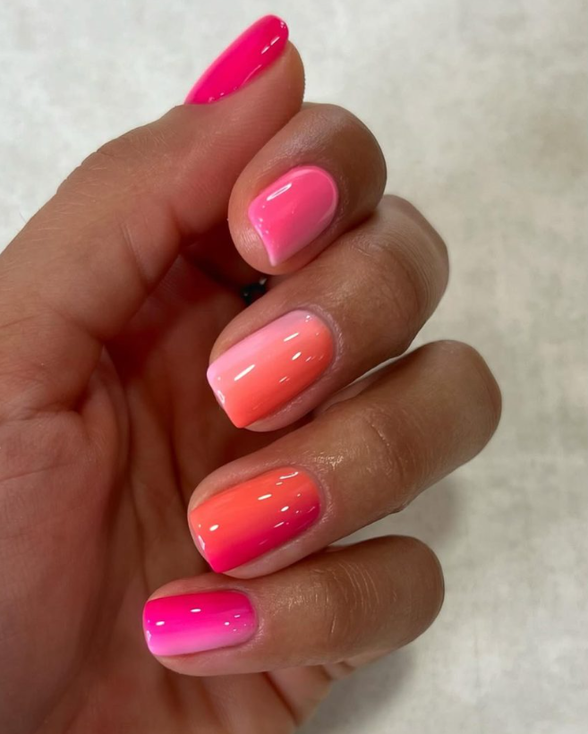 A trim, square shape in a short square length graduates from cool fuchsia to coral on each nail—Miami sundown bottled, basically. The glossy gel makes the gradient seamless, with middle nails falling peachy and outer nails transforming to hot pink. It’s bright without being shiny, that kind of trendy design that looks intentional instead of “busy.”