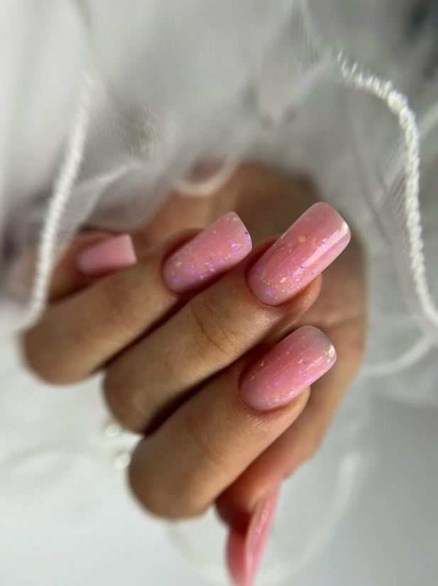 Medium-length square nails fade from blush to a delicate shower of glints—enough glitter to catch light, not enough to feel like a costume.