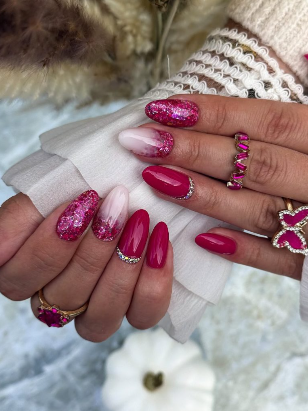 A celebration on ten nails: saturated raspberry solids, jelly pink fades, chunky glitter toppers, and tiny crystal smiles hugging the cuticle. The palette swings between red and pink, which is why it pairs so well with camel coats and berry lips. Ask for oval length with alternating finishes; it photographs beautifully in evening light and reads wonderfully Trendy for winter weddings or girls’ trips.