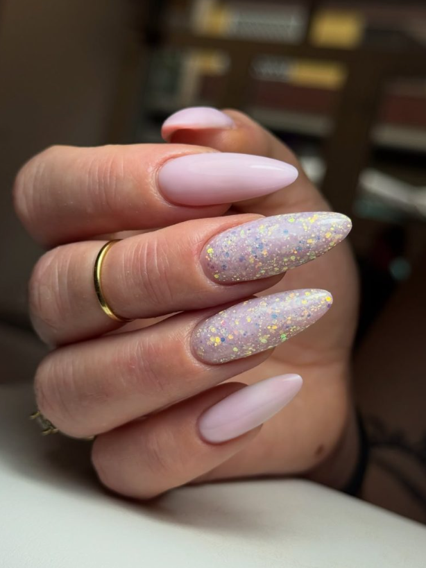 23. Petal-Pink Almond with Opal Glitter Accent—soft, but not shy