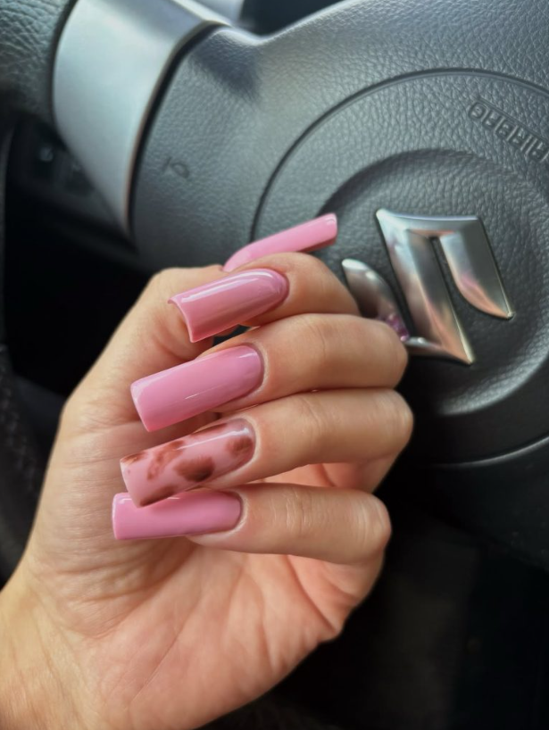Sleek, long square nails in creamy pink with one mocha-marble feature nail. The brown and pink pairing feels fresh for 2026—warm, sophisticated, and quietly bold. Ask for a neutral pink gel on most nails and a coffee-swirl marble on one per hand. Style with trench coats, chocolate knits, or green and olive accessories for a rich palette. The look is editorial, but the design stays streamlined enough for everyday wear.