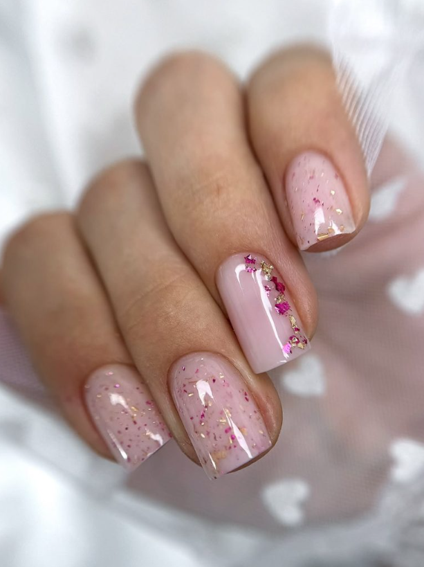 A milky blush base on short, softly square nails gets a whisper of confetti—tiny pink flecks and gold foils—plus one sleek accent panel edged with crushed shards. It’s refined and light, yet the micro glitter keeps the look celebratory.