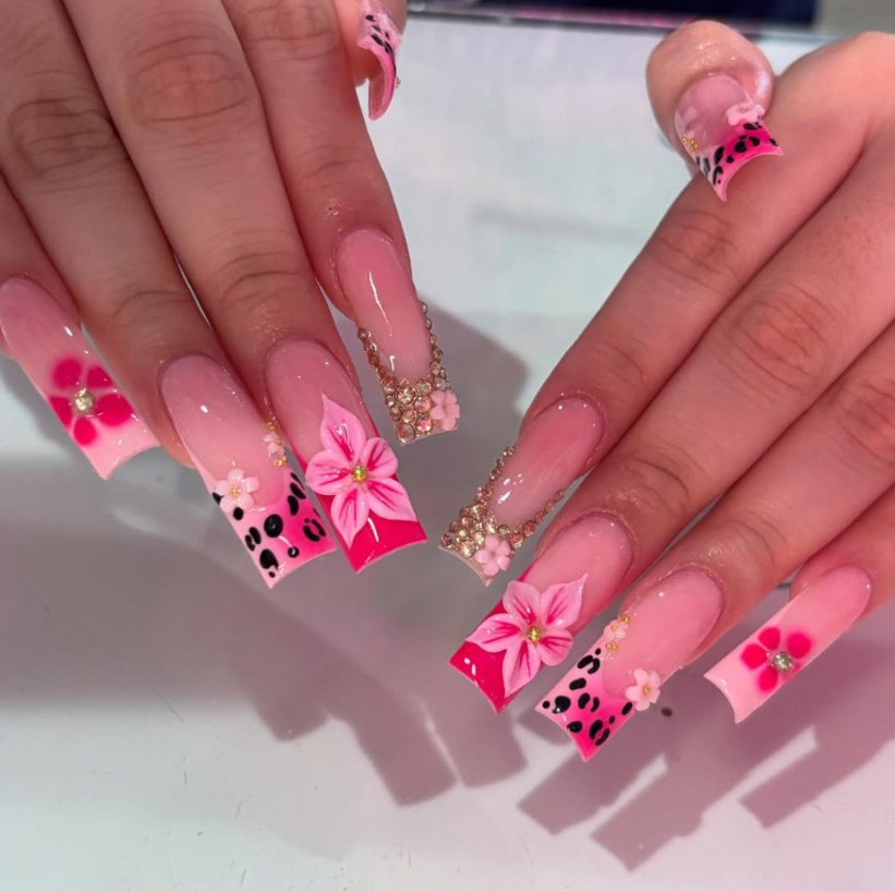 Long square extensions carry everything we love about high-impact salon art: leopard accents (black and pink), sculpted florals, crystal borders, and hot-pink panel tips. Despite the drama, the sheer base keeps it wearable.
