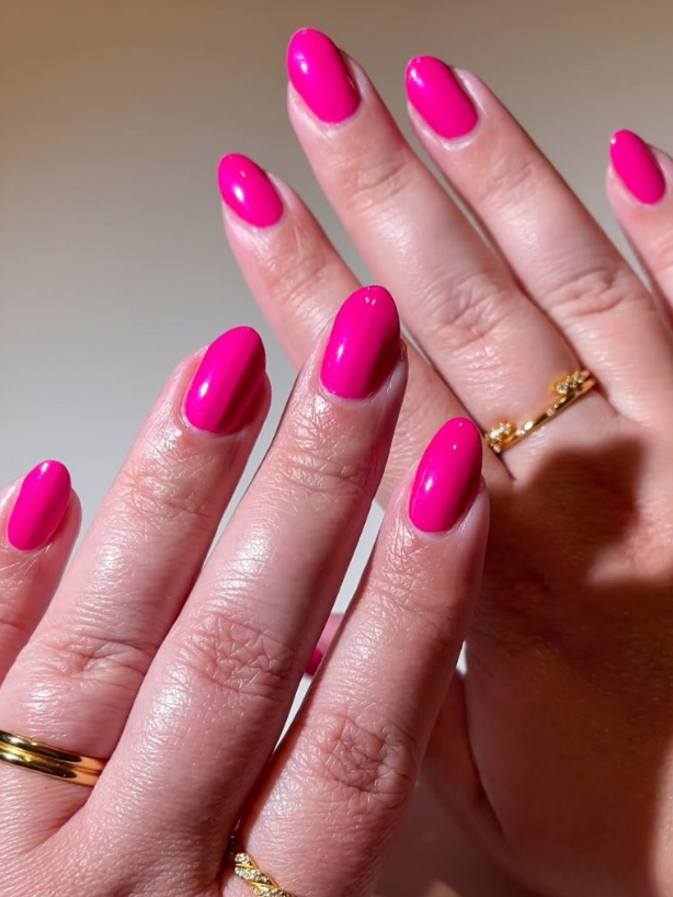 A saturated fuchsia gel on classic ovals. The tone is unapologetically bright and a little hot, yet the simple silhouette keeps it chic.