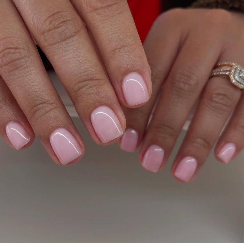 A soft translucent pink veil over natural nails creates a lit-from-within effect. The contouring finish reduces the look of ridges and photographs beautifully at any angle.