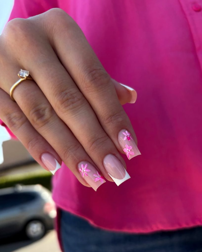 A crisp French tip on a neutral pink base gets a 2026 refresh with glossy, hand-painted (or appliqué) pink daisies on accent nails. The tips are medium square, keeping it chic rather than cutesy—yet still undeniably cute.