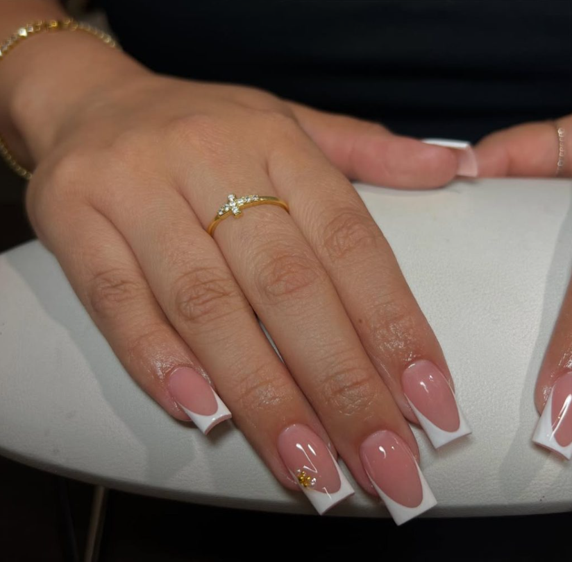 Crisp white angled tips on a rosy-nude base; one accent nail shows a tiny gold charm near the cuticle. True square shape at medium length.