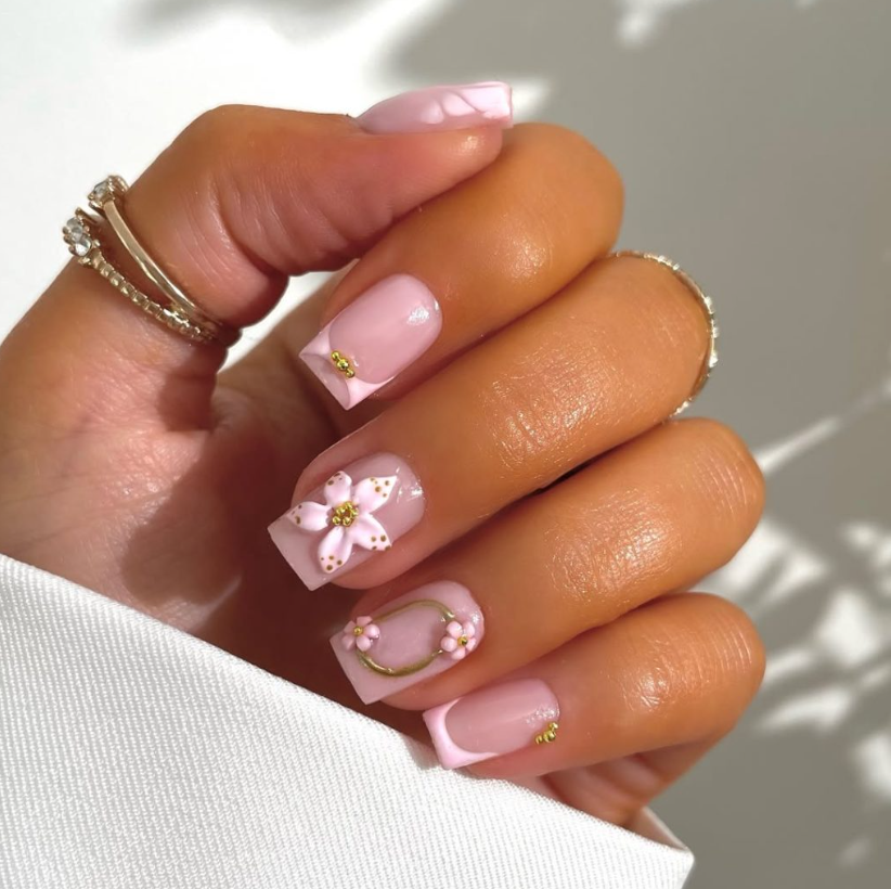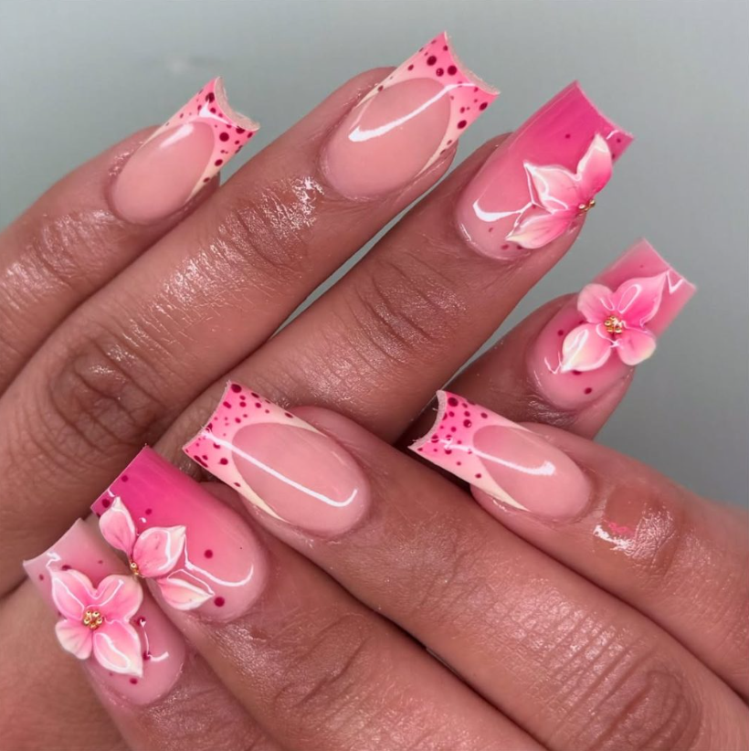 18. Ombre Pink with Freckled Tips & 3D Blossoms