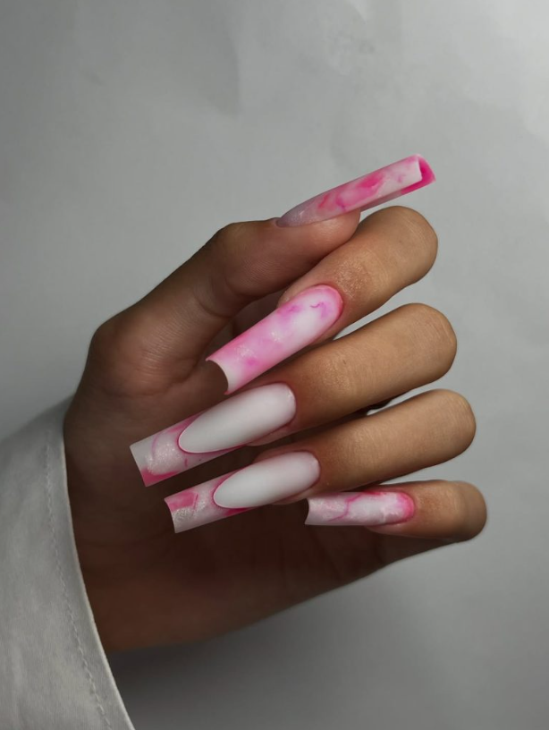 A high-contrast set that blends hazy, marble-like pink with matte-frosted panels and razor-clean neon contours. The silhouette is a true square with a whisper of tapered sidewalls—sleeking the fingers without sacrificing that editorial edge. Think “cool girl at the gallery opening.”