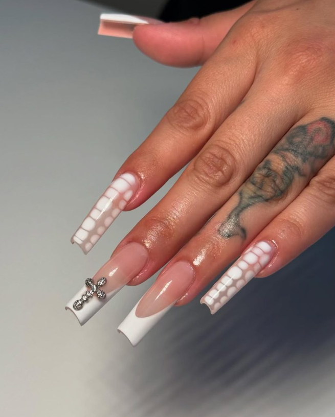 Milky white croc texture on the outer nails, a crystal cross embellishment on a clean square, and a single classic French tip on a sheer almond-square hybrid.