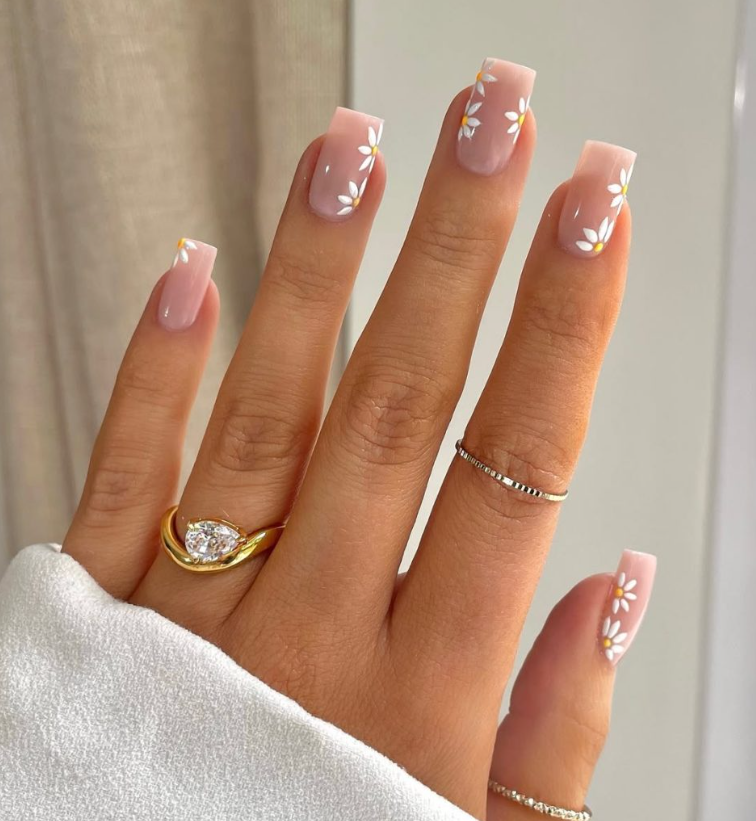 A blush-to-nude ombré base dotted with tiny white daisy petals hugging the corners. The silhouette sits between a soft square and a very lightly tapered coffin—still square-forward from the top view.