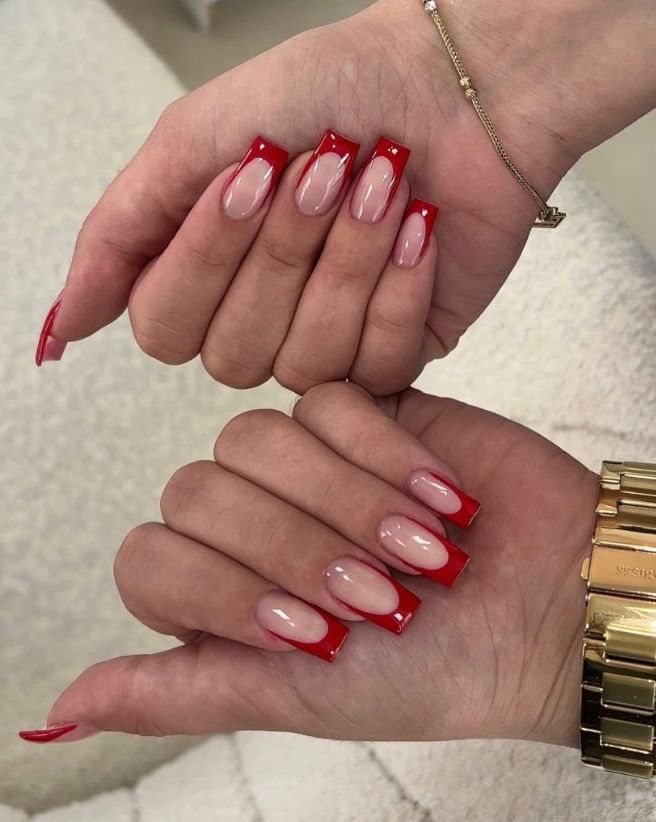 A sheer base framed by bold red tips that dip slightly into the sidewalls—think sculpted French tip with attitude on long, squared edges.