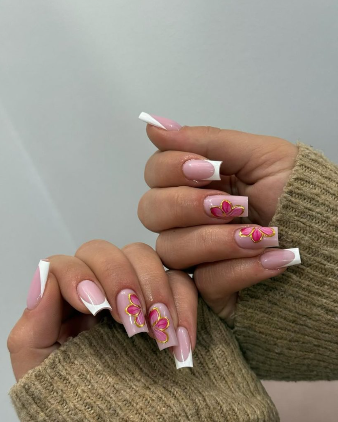 Ballet Pink base, crisp White angled French corners, and two statement nails with petal motifs outlined in gold. The square length is medium–long for maximum canvas.