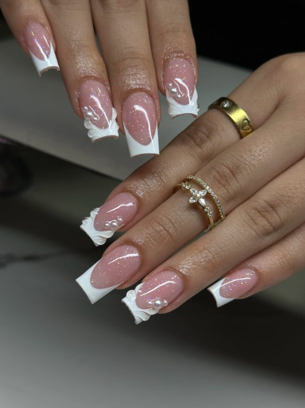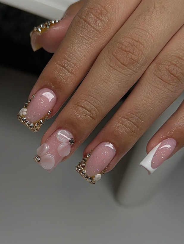 A rosy, translucent base with micro sparkle sets the stage for gilded frames—tiny crystals and beads hugging the cuticle and edges—while one accent shows glossy 3D petals anchored by a gem. A single nail carries a soft swoop of white for a modern French tip twist. The square silhouette is softly Rounded at the corners so it reads refined, not fussy.
