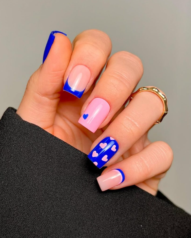 Here, a playful set mixes finishes: clear-to-nude nails with a cobalt French tip, solid baby pink, a cobalt nail packed with cute blush hearts, and one soft-sheer nail with a single heart. The shape is a classic square at a medium length—enough canvas to mix motifs.