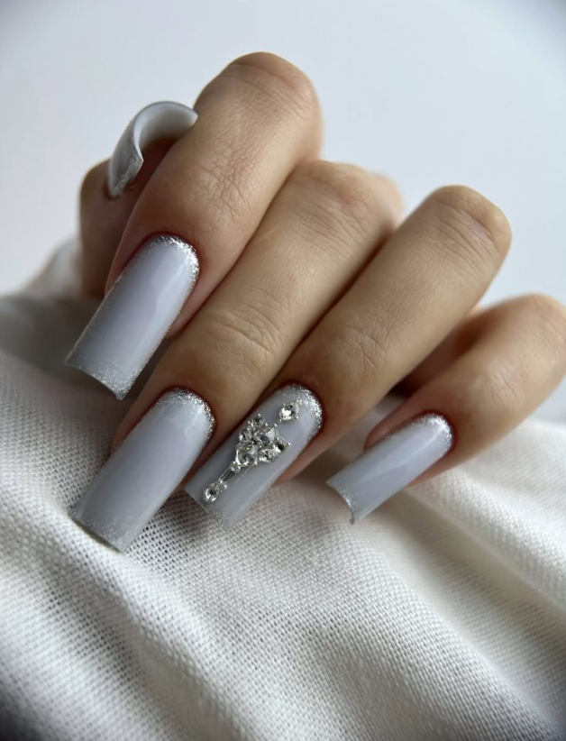 Frosted, mirror-sheened white takes over these long squares, finished with a silver “cuticle halo” that reads like a reverse French tip. One centerpiece nail stacks crystal gems into a slim cross for couture shine. The shape is a crisp square with the slightest tapered sidewalls—sleeking the fingers without losing that clean edge.