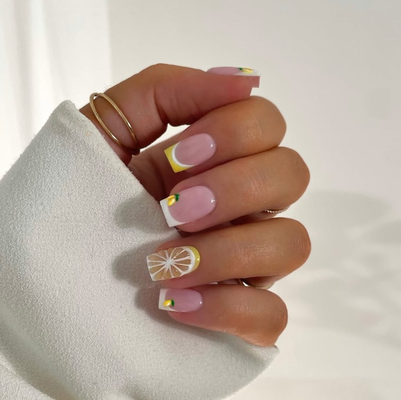 Think café terrazza in Positano: a sheer pink base, crisp white French edges, then a butter-yellow halo under the tips and tiny lemon decals near the corners. One nail features a translucent slice of lemon art framed with yellow.
