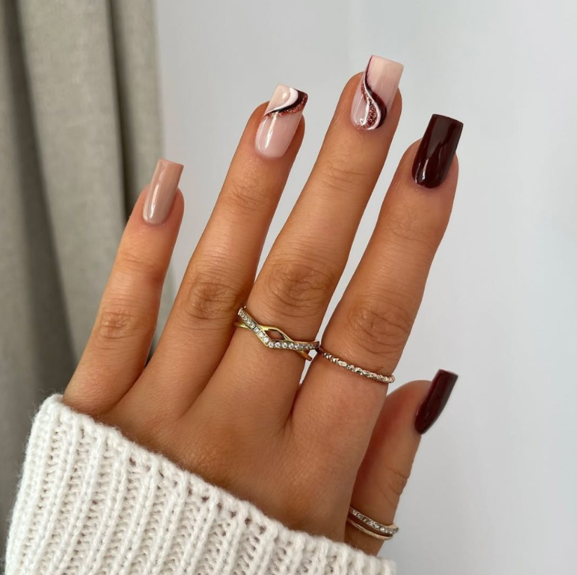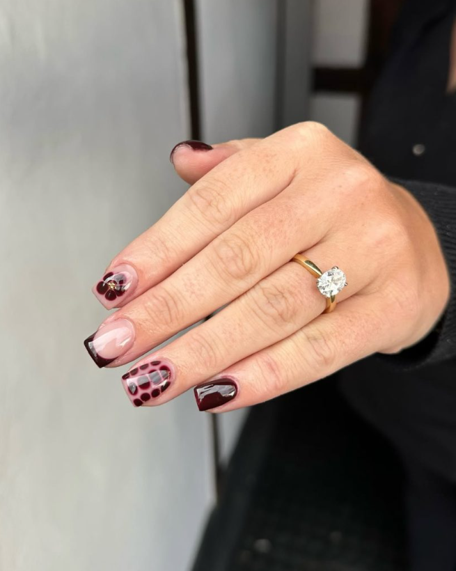 A moody cocktail of glossy merlot, mini-plaid panels, dotted accents, and a slim burgundy French tip—all on a compact square. The palette leans wine-red with cocoa undertones, a chic bridge between red and brown for fall.