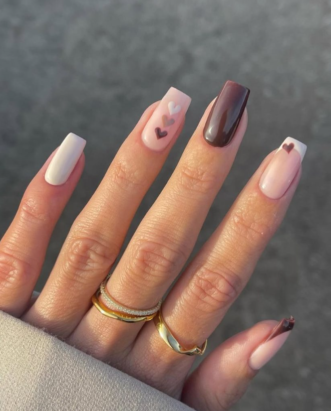A wardrobe of nudes: creamy ivory, translucent pink, and glossy mocha—punctuated by stacked cocoa hearts and a deep coffee statement nail. The edges are sharp square, the length skews Long but wearable.
