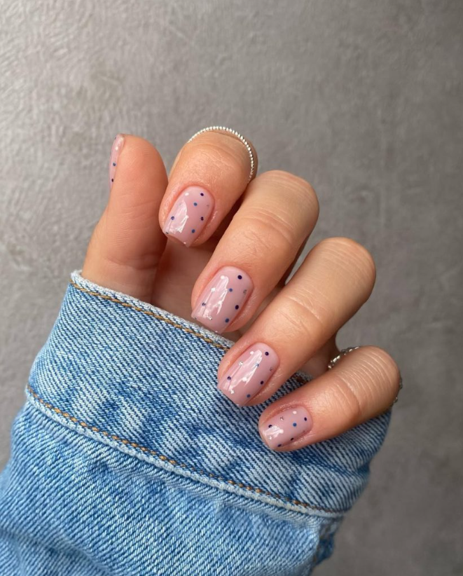 A glossy, neutral base scattered with petite navy dots. The square silhouette keeps it crisp; the micro-specks add personality without reading as busy.