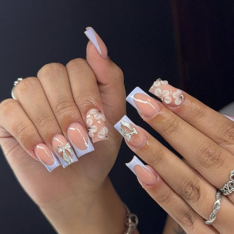 A baby-periwinkle border modernizes the square French, and then comes the drama: crystal-paved bows and glossy 3D florals on select nails. The base stays neutral for balance.
