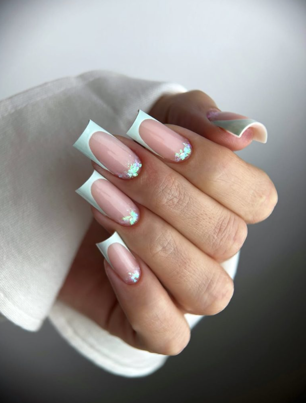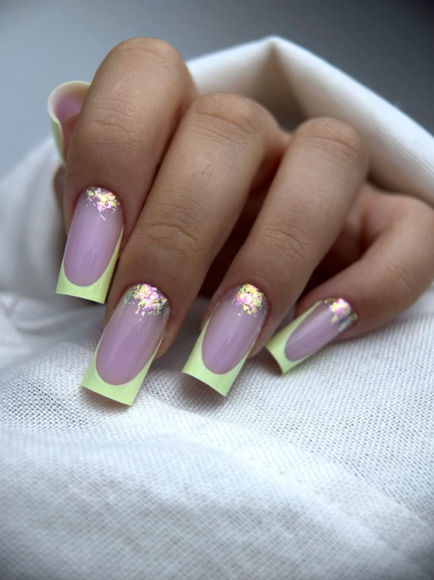 Pastel pistachio frames the tips and sidewalls, while crushed iridescent foil shimmers along the cuticle. The result: a crisp negative-space French tip that sparkles just enough in sunlight.