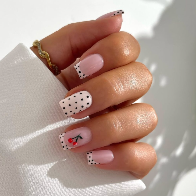 A playful set that alternates between milky ivory covered in black dots and sheer pink squares edged with tiny dotted French tips. A single accent carries two glossy cherries—tiny stems and all.