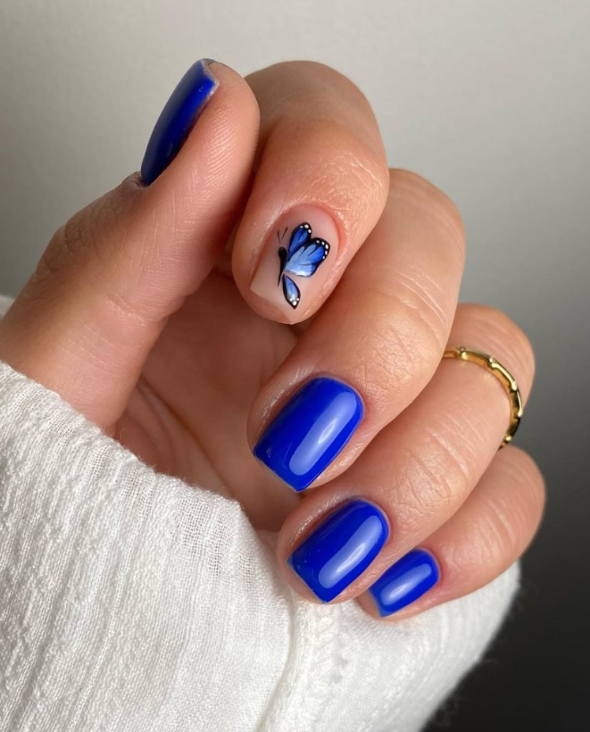 A saturated cobalt Blue floods every nail except one: the accent shows a delicate butterfly on a clear, blush-toned base. The crisp square edges keep the bold color feeling editorial rather than playful.