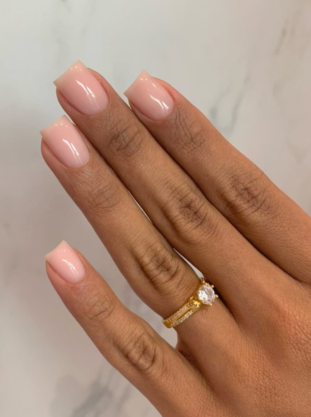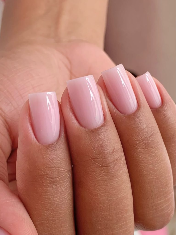 Barely-there blush on impeccably filed short squares. This is the manicure equivalent of a great white tee—minimal but intentional.