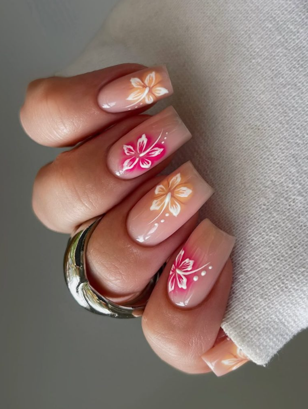 Latte-to-clear ombré squares with hand-painted hibiscus-style flowers—peach, ivory, and a vibrant pink—placed diagonally to slim the nail. A trio of white dots trails from the petals for movement.