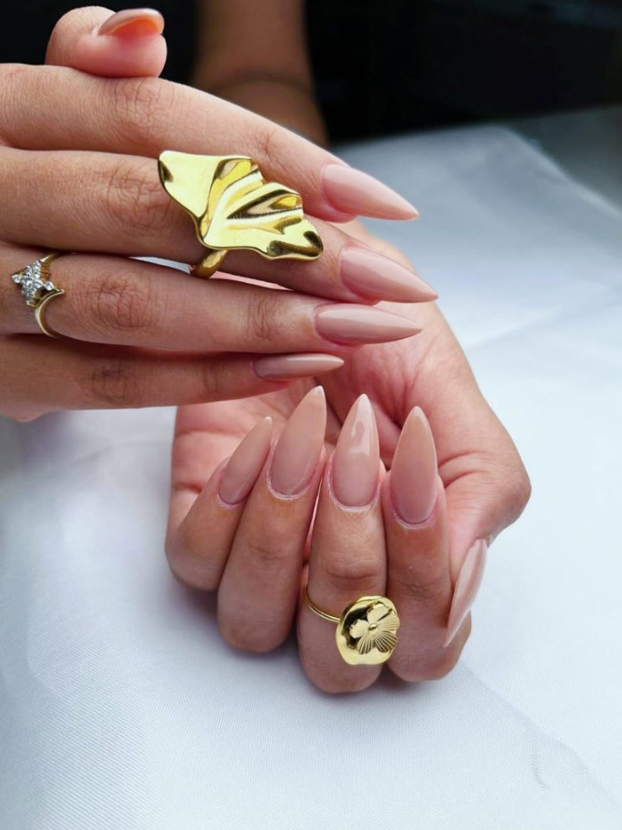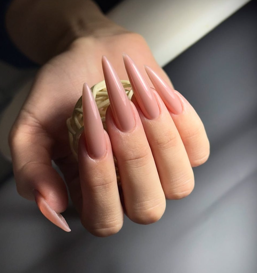 A neutral blush nude elongated into sleek, tapered points—clean, versatile, and camera-ready. This is the “capsule wardrobe” of nail looks: it flatters every outfit and keeps hands looking refined. Styling tip: Black turtleneck, trench, and loafers for a polished weekday uniform. Salon notes: Request a soft apex and ultra-thin cuticle application; re-seal the tips at week two to extend wear.