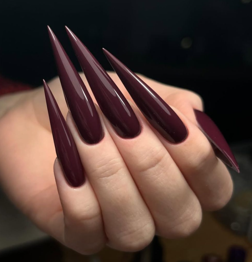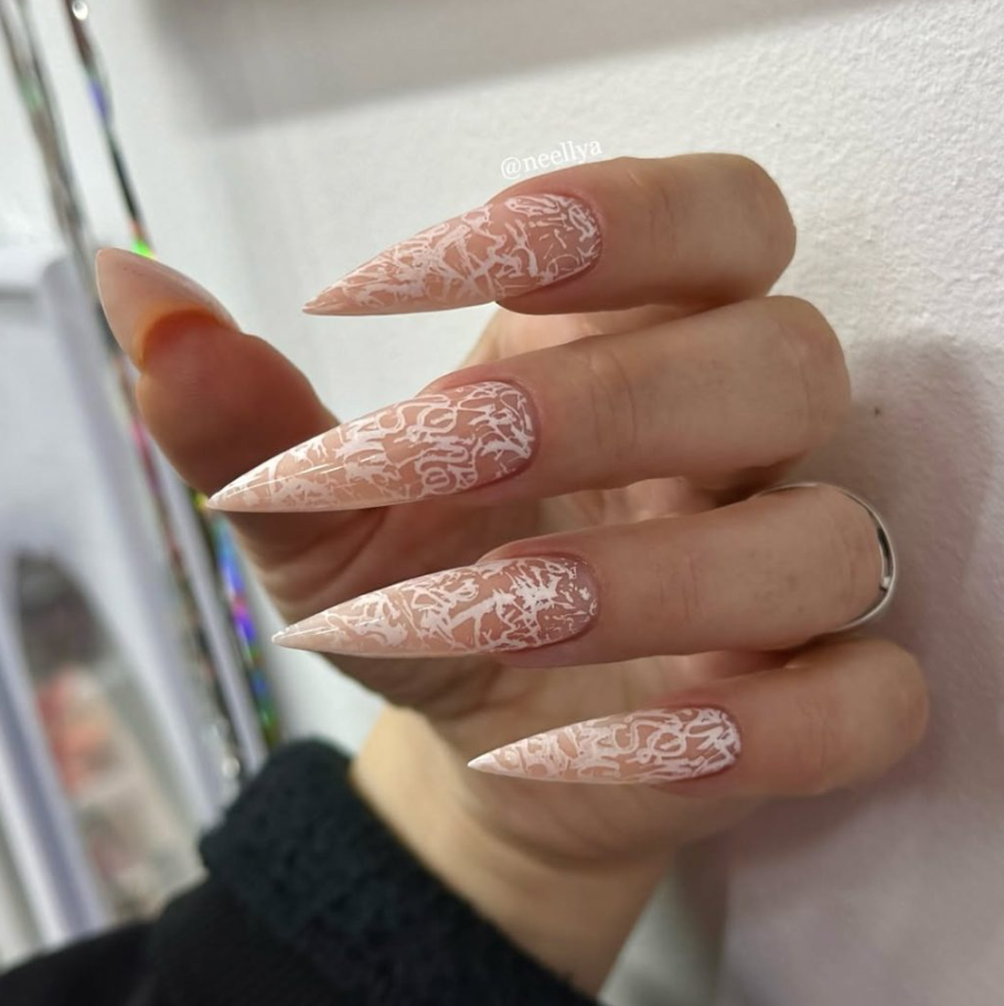 A single-shade nude latte in a glossy finish proves how striking simple can be on a stiletto silhouette. This set is the perfect “elevated basic” for interviews, client meetings, and everyday polish. Styling tip: Taupe blazer, white button-down, delicate chain bracelet—quiet luxury vibes. Salon notes: Choose a self-leveling builder for a glass-smooth surface; keep tips 1–2 mm shorter for typing comfort.