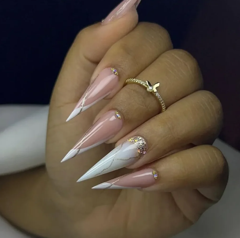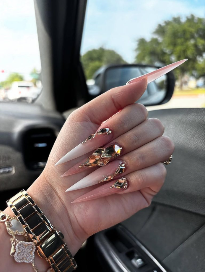 Razor-long stilettos pair a blush-to-white fade with oversized champagne prisms arranged down the center of two nails. The faceted crystals throw light like a mirrored clutch—glamorous without tipping into costume. This is red-carpet art you can wear to an anniversary dinner or holiday party and feel instantly taller. Styling tip: Keep the palette warm—silky camel blazer, slip tank, gold hoops—to echo the stones.
