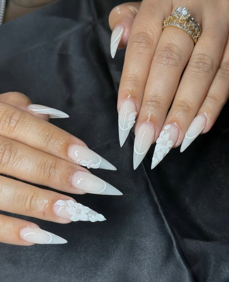 Milky ombré fades into chalk-white points, finished with sculpted petals and whisper-thin contour lines. It’s bridal-level polish for anyone who loves ultra-elegant white sets without sparkle overload. Style it: Cream suit, pearl studs, metallic clutch. Salon notes: Request soft builder for structure; 3D petals in thin layers so they wear flat.