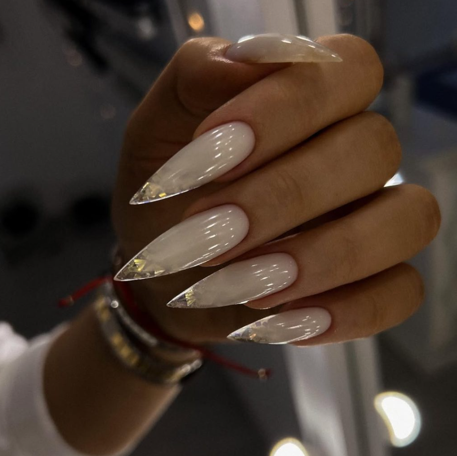 An icy milk-sheer base melts into crystal tips that look like carved quartz. The look is whisper-soft but dramatic thanks to the razor-sharp shape. It’s a minimalist French interpretation without harsh smile lines—perfect if you love simple yet statement-making designs.