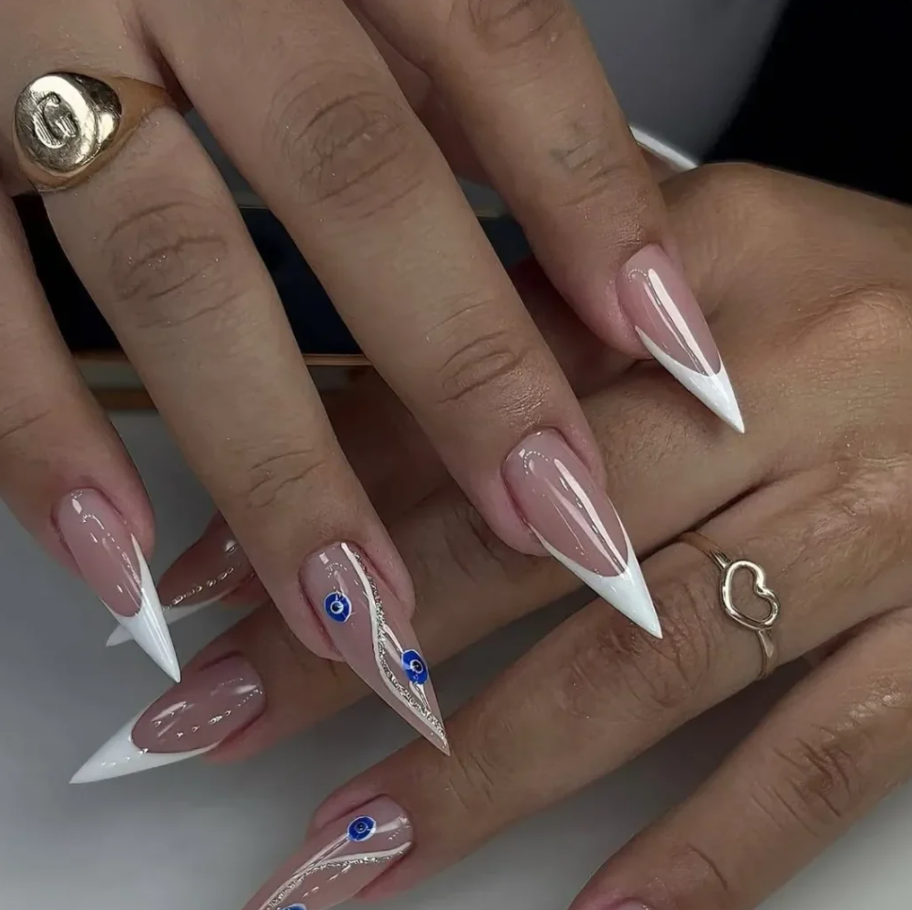 Milky blush meets needle-sharp porcelain French tips, punctuated by tiny evil-eye decals along a silver ripple. It’s protective amulet energy, updated for 2026—a conversation starter that still reads polished. Styling tip: Pair with a navy blazer or sapphire studs to echo the accents without overmatching.