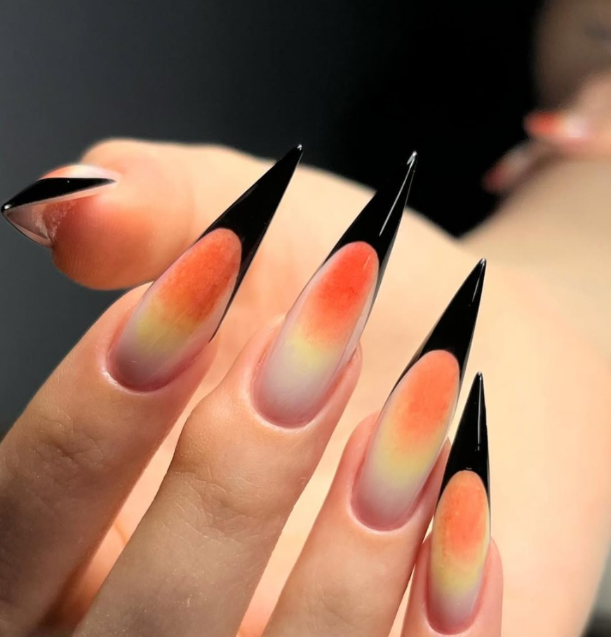 A diffused coral-to-citrus ombré glows under inky, micro-sharp peaks. It’s a power move: soft color for the day; midnight tips for the night. I wore a similar set to a July rooftop event—the compliments came from the bartender and the brand VP.