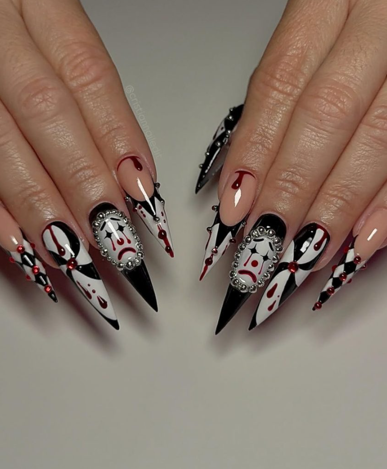 Graphic diamonds, teardrops, and masked cameos dance across glossy black and porcelain panels with pinpoint red details. It’s whimsical and theatrical—the exact kind of Goth-tinged art that turns heads at concerts and gallery hops. Styling tip: A monochrome black suit, cherry lips, and tiny rhinestone studs to echo the nail gems. Salon notes: Ask for almond-nude base panels to soften contrast; use gel studs and metallic frames only on two nails for comfort.