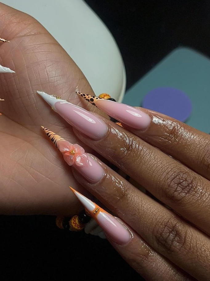 Rosy base with porcelain French tip spikes, spliced with tropical orange accents and a petite 3D flower. A hint of animal-dot detail on one tip keeps it playful, not precious. Style it: Wrap dress, raffia tote, delicate anklet. Salon notes: Place the 3D bloom low on the nail for longevity and snag-free wear.